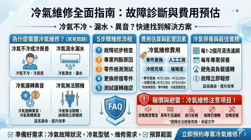 冷氣維修是維持空調正常運作的重要步驟。當冷氣出現不冷、漏水或異音時,應盡早檢查問題並尋求專業維修。透過定期保養與正確使用方式,可以降低冷氣故障機率並延長設備壽命。
