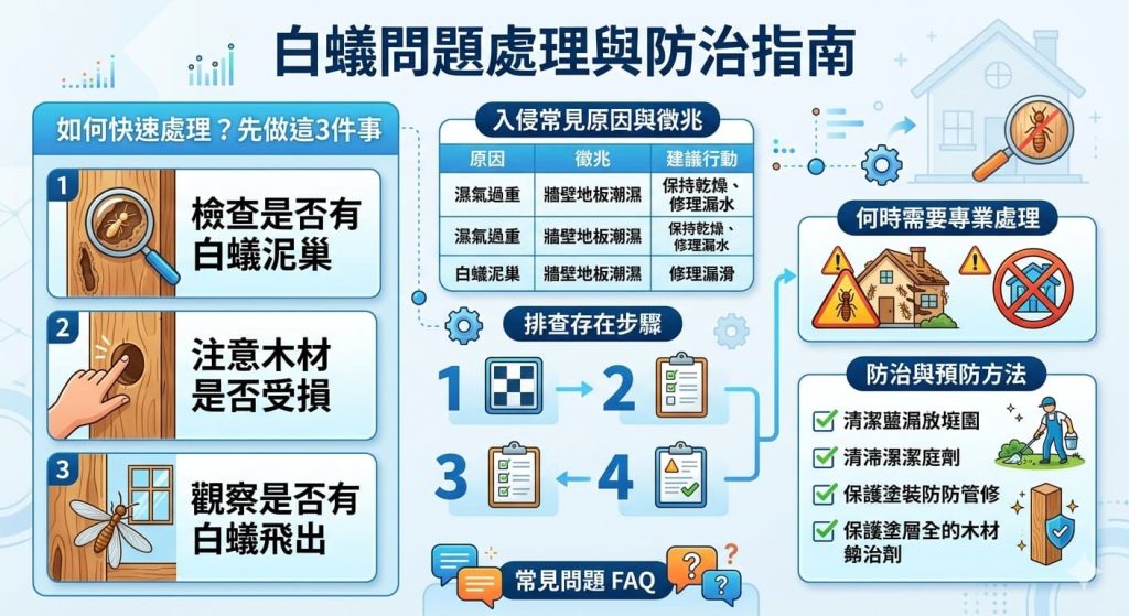 如果這些檢查顯示白蟻存在,你可以進一步排查問題源頭並進行處理。若不處理,白蟻會迅速擴散並造成更嚴重的損害。